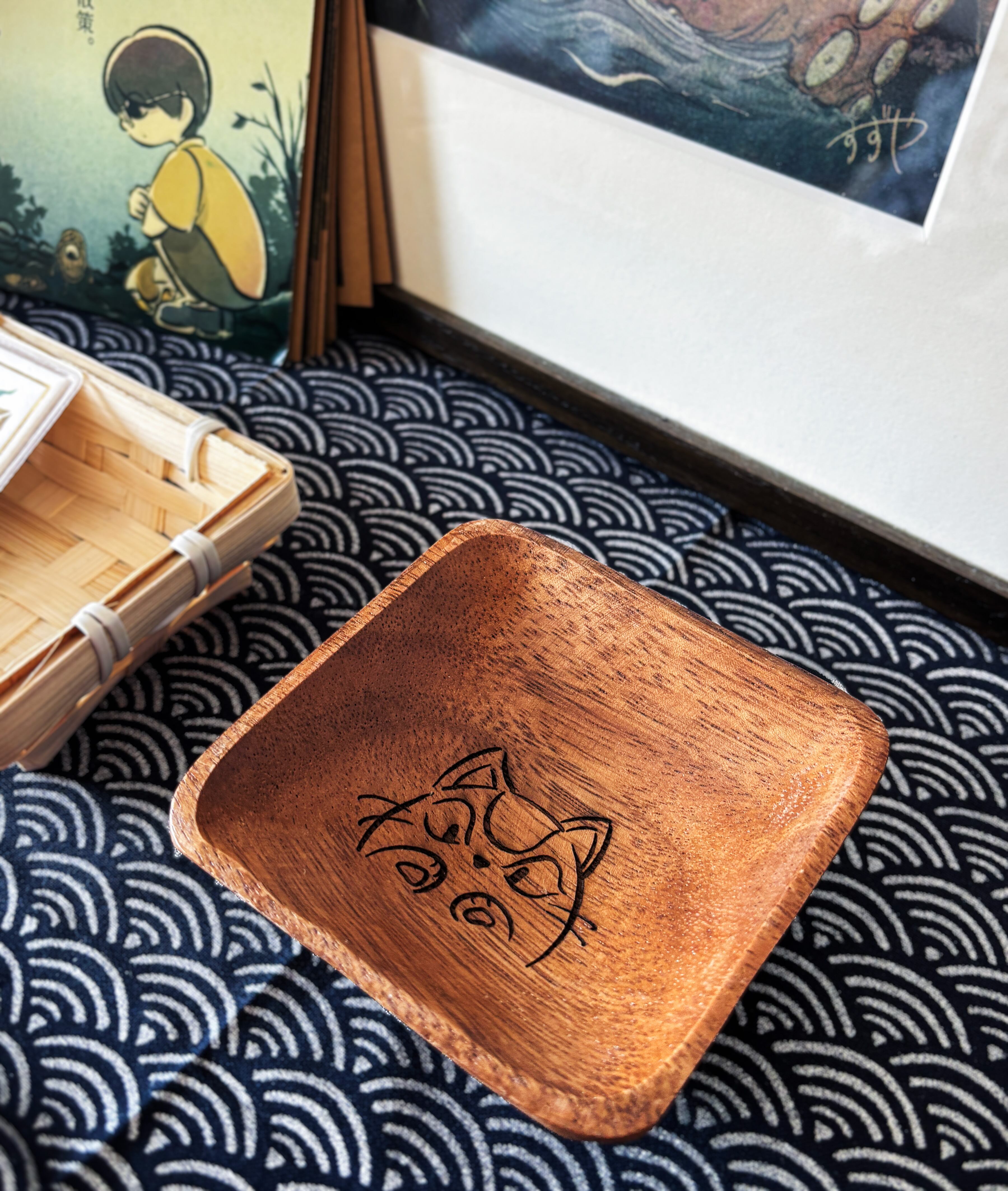 日々の小物をすねこすりが守る、小さな木製トレーです。